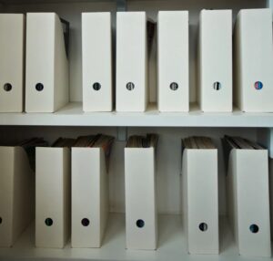 Wenn Sie Broschüren, Landkarten oder ganz dünne Bücher besitzen, stellen Sie sie in Stehsammler in der gewünschten Höhe (A4, A5…) und beschriften Sie nach Wunsch den Inhalt. Es gibt im Fachhandel oder online eine breite Auswahl an Karton-, Kunststoff- oder Stoffsammlern.